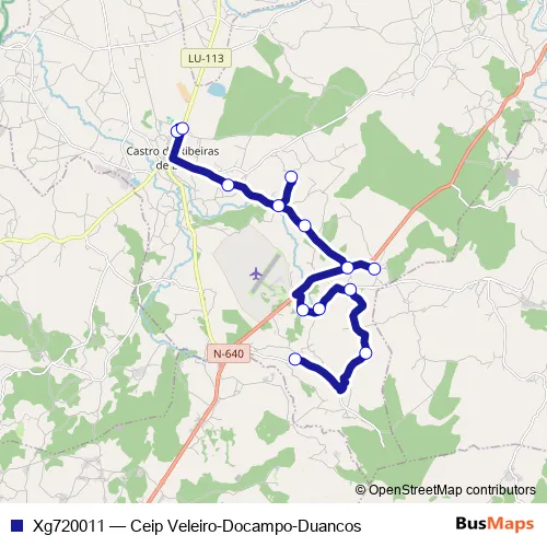 The first stop of the Xg720011 bus route is Ceip Veleiro-Docampo and the last stop is Duancos. Xg720011 (Ceip Veleiro-Docampo-Duancos) is operational during dies feiners.