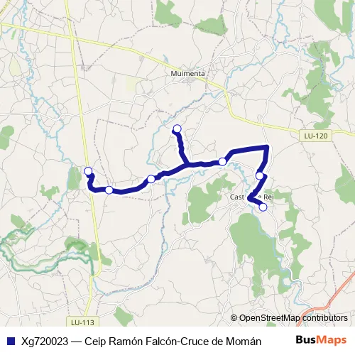 The first stop of the Xg720023 bus route is Cruce DE Momán and the last stop is Ceip Ramón Falcón. Xg720023 (Ceip Ramón Falcón-Cruce de Momán) is operational during dies feiners.