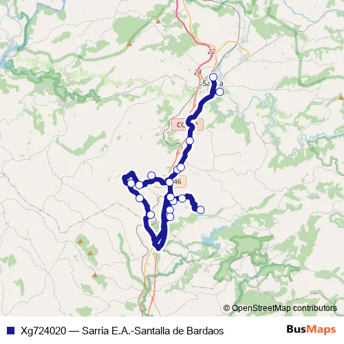 The first stop of the Xg724020 bus route is Santalla DE Bardaos and the last stop is Sarria E.A.. Xg724020 (Sarria E.A.-Santalla de Bardaos) is operational during dies feiners.