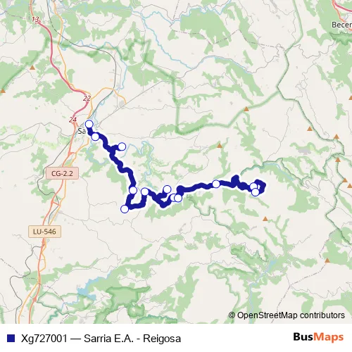 The first stop of the Xg727001 bus route is Sarria E.A. and the last stop is Reigosa. Xg727001 (Sarria E.A. - Reigosa) is operational during dies feiners.