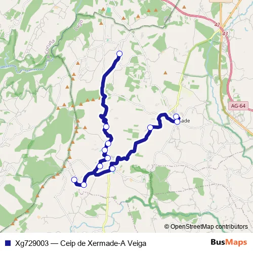 The first stop of the Xg729003 bus route is Ceip DE Xermade and the last stop is A Veiga. Xg729003 (Ceip de Xermade-A Veiga) is operational during dies feiners.