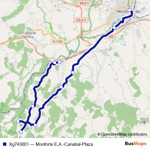 The first stop of the Xg743001 bus route is Monforte E.A. and the last stop is Canabal-Plaza. Xg743001 (Monforte E.A.-Canabal-Plaza) is operational during dies feiners.