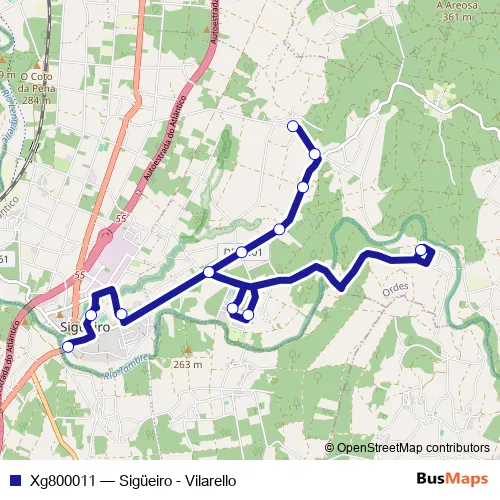 The first stop of the Xg800011 bus route is Sigüeiro and the last stop is Vilarello. Xg800011 (Sigüeiro - Vilarello) is operational during dies feiners.