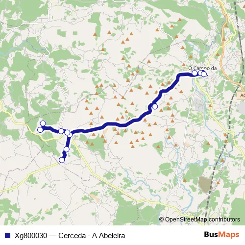 The first stop of the Xg800030 bus route is Cerceda and the last stop is A Abeleira. Xg800030 (Cerceda - A Abeleira) is operational during cada dia.