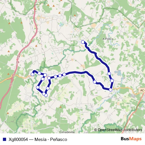 The first stop of the Xg800054 bus route is Mesía and the last stop is Peñasco. Xg800054 (Mesía - Peñasco) is operational during dies feiners.