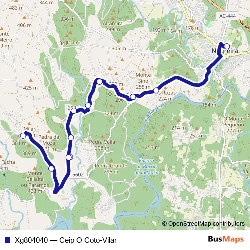 The first stop of the Xg804040 bus route is Ceip O Coto and the last stop is Vilar. Xg804040 (Ceip O Coto-Vilar) is operational during dies feiners.