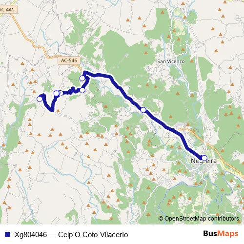 The first stop of the Xg804046 bus route is Ceip O Coto and the last stop is Vilacerio. Xg804046 (Ceip O Coto-Vilacerío) is operational during dies feiners.