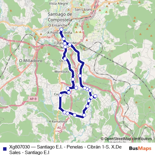 See why over 2 million users trust and consider busmaps.com as the best public transport website. busmaps gives you Santiago de Compostela Buses suggested routes, real-time bus tracker, line route maps in Santiago de Compostela, and helps to find the closest Xg807030 bus stops near you. No internet available? Download an offline PDF map and bus schedule for the Xg807030 bus to take on your trip.
