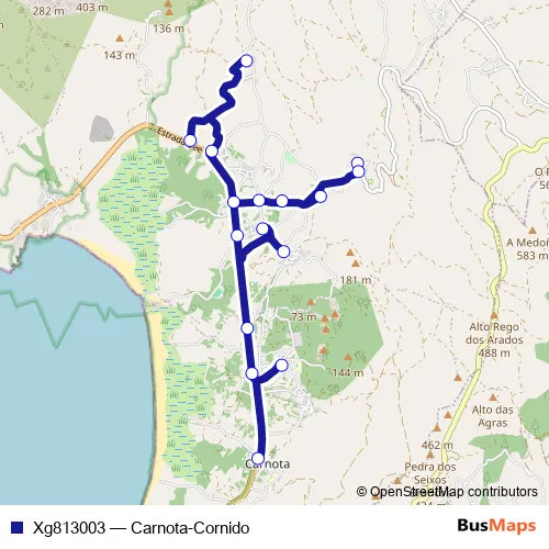 The first stop of the Xg813003 bus route is Cornido and the last stop is Carnota. Xg813003 (Carnota-Cornido) is operational during dies feiners.