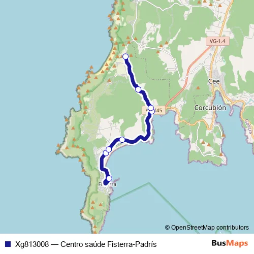The first stop of the Xg813008 bus route is Centro Saúde Fisterra and the last stop is Padris. Xg813008 (Centro saúde Fisterra-Padrís) is operational during dies feiners.