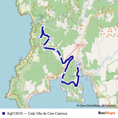 The first stop of the Xg813010 bus route is Ceip Vila de Cee and the last stop is Canosa. Xg813010 (Ceip Vila de Cee-Canosa) is operational during dies feiners.