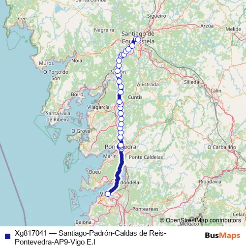 The first stop of the Xg817041 bus route is Vigo E.I. and the last stop is Santiago E.I.. Xg817041 (Santiago-Padrón-Caldas de Reis-Pontevedra-AP9-Vigo E.I) is operational during cada dia.