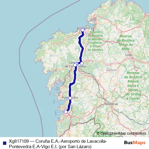 Click here to view the nearest Xg817109 - Coruña E.A.-Aeroporto de Lavacolla- Pontevedra E.A-Vigo E.I. (por San Lázaro) bus stop.