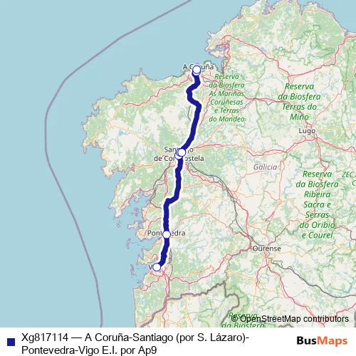 The first stop of the Xg817114 bus route is Vigo E.I. and the last stop is Coruña E.A.. Xg817114 (A Coruña-Santiago (por S. Lázaro)-Pontevedra-Vigo E.I. por Ap9) is operational during dies feiners.