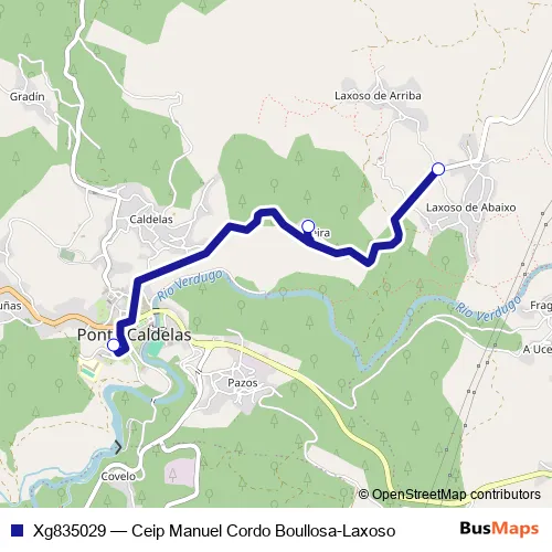The first stop of the Xg835029 bus route is Ceip Manuel Cordo Boullosa and the last stop is Laxoso. Xg835029 (Ceip Manuel Cordo Boullosa-Laxoso) is operational during dies feiners.