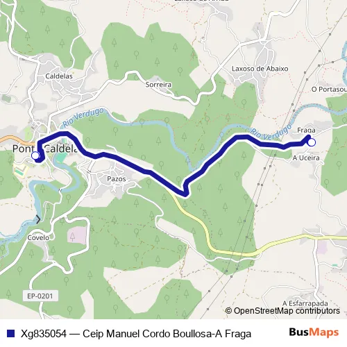 The first stop of the Xg835054 bus route is Ceip Manuel Cordo Boullosa and the last stop is A Fraga. Xg835054 (Ceip Manuel Cordo Boullosa-A Fraga) is operational during dies feiners.