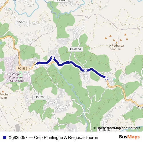 The first stop of the Xg835057 bus route is Ceip Plurilingüe A Reigosa and the last stop is Touron. Xg835057 (Ceip Plurilingüe A Reigosa-Touron) is operational during dies feiners.