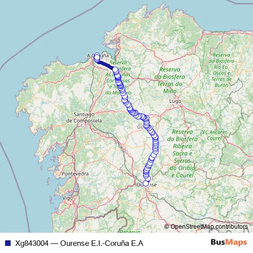 The first stop of the Xg843004 bus route is Ourense E.I. and the last stop is Coruña E.A.. Xg843004 (Ourense E.I.-Coruña E.A) is operational during cada dia.