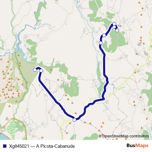 The first stop of the Xg845021 bus route is A Picota and the last stop is Cabanude. Xg845021 (A Picota-Cabanude) is operational during dies feiners.