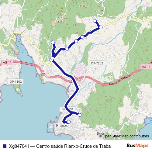 The first stop of the Xg847041 bus route is Cruce De Traba and the last stop is Centro Saude Rianxo. Xg847041 (Centro saúde Rianxo-Cruce de Traba) is operational during dies feiners.