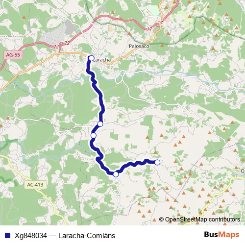 The first stop of the Xg848034 bus route is Laracha Concello and the last stop is Comiáns. Xg848034 (Laracha-Comiáns) is operational during dies feiners.