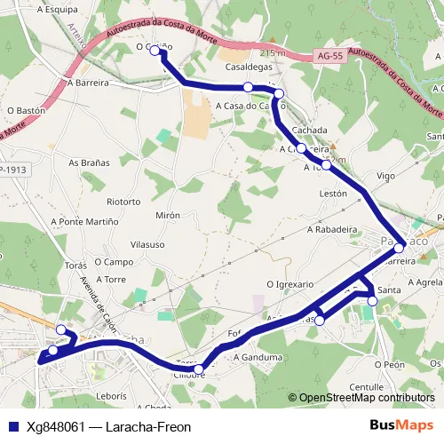 The first stop of the Xg848061 bus route is Laracha Concello and the last stop is Freon. Xg848061 (Laracha-Freon) is operational during dies feiners.