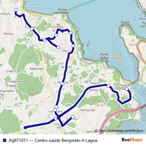 The first stop of the Xg871071 bus route is Centro Saude Bergondo and the last stop is A Lagoa. Xg871071 (Centro saúde Bergondo-A Lagoa) is operational during dies feiners.