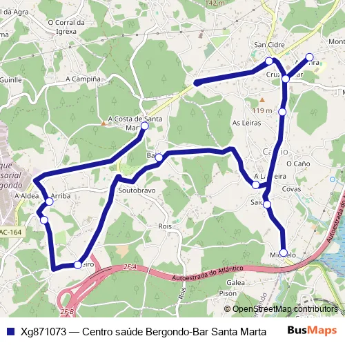 The first stop of the Xg871073 bus route is Centro Saude Bergondo and the last stop is BAR Santa Marta. Xg871073 (Centro saúde Bergondo-Bar Santa Marta) is operational during dies feiners.