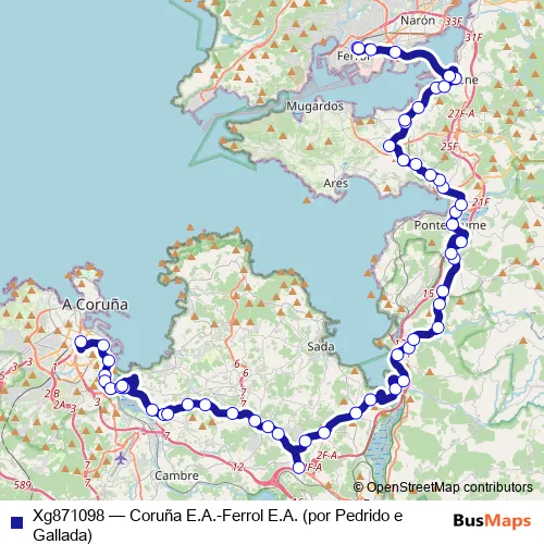 The first stop of the Xg871098 bus route is Coruña E.A. and the last stop is Ferrol E.A.. Xg871098 (Coruña E.A.-Ferrol E.A. (por Pedrido e Gallada)) is operational during cada dia.