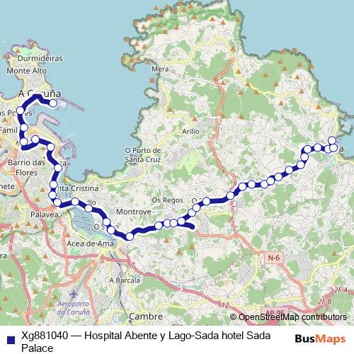 The first stop of the Xg881040 bus route is Hospital Abente y Lago and the last stop is