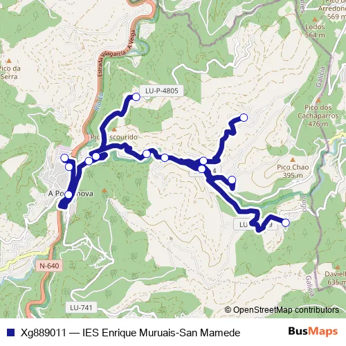 The first stop of the Xg889011 bus route is IES Enrique Muruais and the last stop is SAN Mamede. Xg889011 (IES Enrique Muruais-San Mamede) is operational during dies feiners.