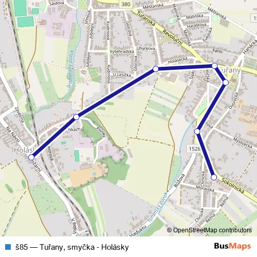 The first stop of the š85 bus route is Holásky and the last stop is Tuřany, smyčka. š85 (Tuřany, smyčka - Holásky) is operational during ve všední dny.