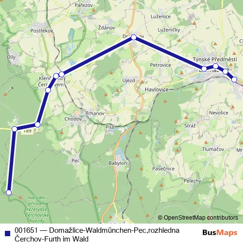 The first stop of the 001651 bus route is Domažlice,Vlakové nádraží and the last stop is Pec,rozhledna Čerchov. 001651 (Domažlice-Waldmünchen-Pec,rozhledna Čerchov-Furth im Wald) is operational during o víkendech.