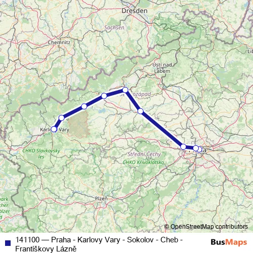 The first stop of the 141100 bus route is Praha, ÚAN Florenc and the last stop is Karlovy Vary, terminál. 141100 (Praha - Karlovy Vary - Sokolov - Cheb - Františkovy Lázně) is operational during denně.