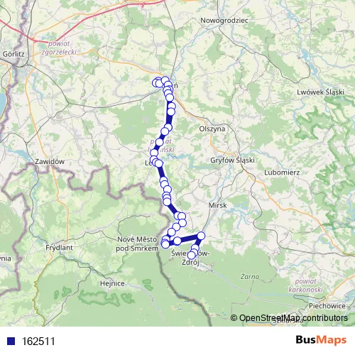 Mikołaja Reja - Kazimierza Wielkiego - Mikołaja Kopernika - Plac Szarych Szeregów - Dworcowa - Tadeusza Kościuszki - Leśna - Tadeusza Kościuszki - Baworowo - Tadeusza Kościuszki - Osiedle - Dworcowa - Długa - Sudecka - Sanatoryjna - Aleja Wojska Polskiego - Grunwaldzka - Widokowa