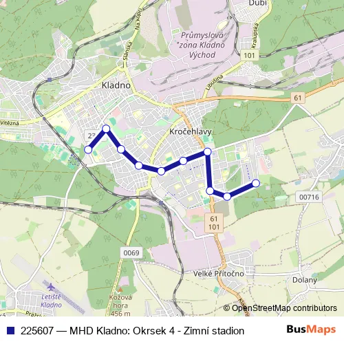 The first stop of the 225607 bus route is Kladno,Okrsek 4 and the last stop is Kladno,zimní stadion. 225607 (MHD Kladno: Okrsek 4 - Zimní stadion) is operational during o víkendech.
