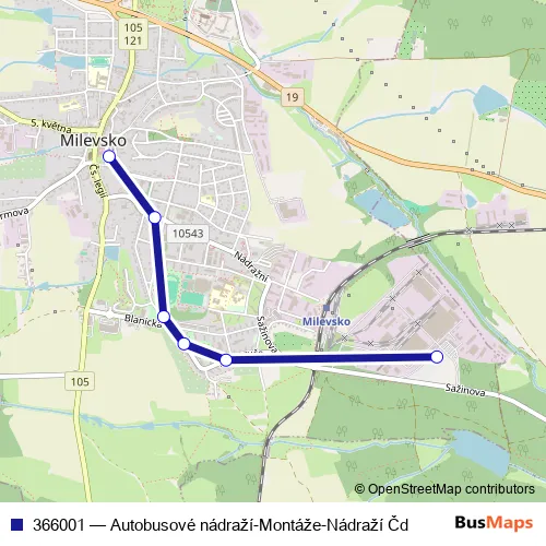 The first stop of the 366001 bus route is Milevsko,Autobusové nádraží and the last stop is Milevsko,Zvvz. 366001 (Autobusové nádraží-Montáže-Nádraží Čd) is operational during ve všední dny.