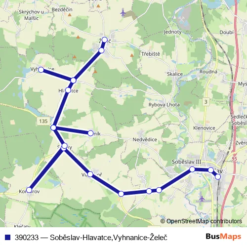 The first stop of the 390233 bus route is Soběslav,aut.nádr. and the last stop is Želeč. 390233 (Soběslav-Hlavatce,Vyhnanice-Želeč) is operational during ve všední dny.