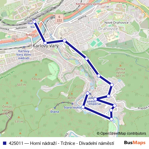The first stop of the 425011 bus route is Karlovy Vary,Horní nádraží and the last stop is Karlovy Vary,Divadelní náměstí. 425011 (Horní nádraží - Tržnice - Divadelní náměstí) is operational during denně.