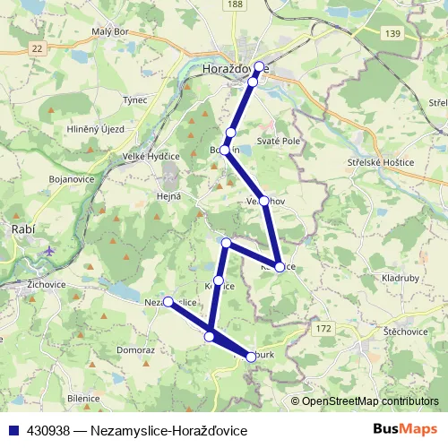 The first stop of the 430938 bus route is Horažďovice,žel.st. and the last stop is Nezamyslice. 430938 (Nezamyslice-Horažďovice) is operational during ve všední dny.
