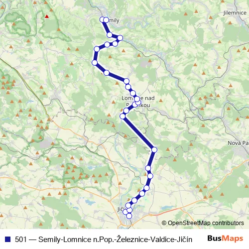The first stop of the 501 bus route is Jičín, autobusová stanice and the last stop is Semily, Terminál. 501 (Semily-Lomnice n.Pop.-Železnice-Valdice-Jičín) is operational during denně.