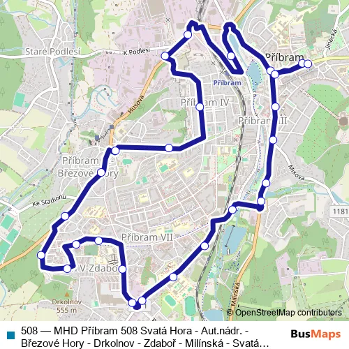The first stop of the 508 bus route is Příbram,Jiráskovy sady and the last stop is Příbram,Jiráskovy sady. 508 (MHD Příbram 508 Svatá Hora - Aut.nádr. - Březové Hory - Drkolnov - Zdaboř - Milínská - Svatá Hora) is operational during denně.