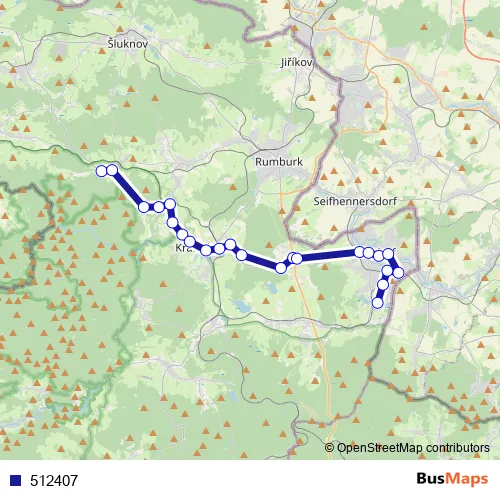 The first stop of the 512407 bus route is Staré Krecany,Brtníky,Na ruzku and the last stop is Varnsdorf, Tos. 512407 is operational during denně.