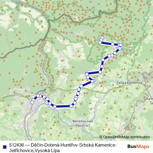 Click here to view the nearest 512436 - Děčín-Dobrná-Huntířov-Srbská Kamenice-Jetřichovice,Vysoká Lípa bus stop.