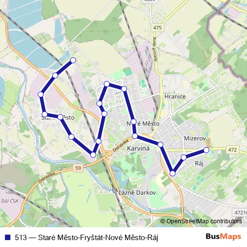 The first stop of the 513 bus route is Karviná, Ráj, Na Kopci and the last stop is Karviná, Staré Město, konečná. 513 (Staré Město-Fryštát-Nové Město-Ráj) is operational during denně.