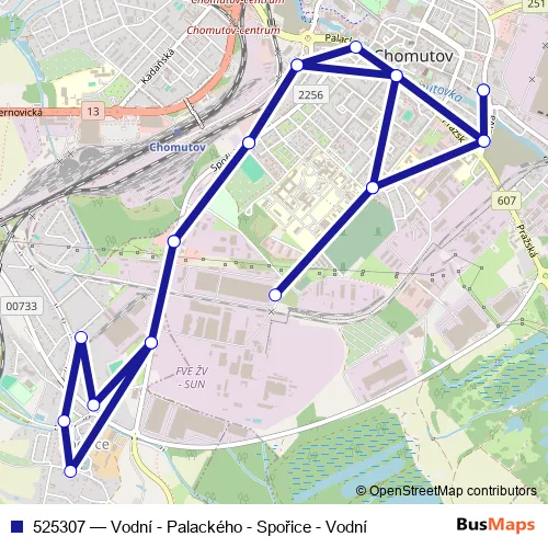 The first stop of the 525307 bus route is Chomutov,Vodní and the last stop is Chomutov,Vodní. 525307 (Vodní - Palackého - Spořice - Vodní) is operational during denně.