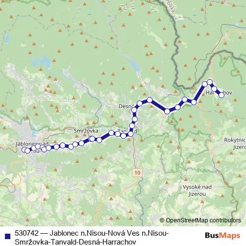 The first stop of the 530742 bus route is Jablonec n.Nisou,hlavní nádraží and the last stop is Tanvald,centrum. 530742 (Jablonec n.Nisou-Nová Ves n.Nisou-Smržovka-Tanvald-Desná-Harrachov) is operational during denně.