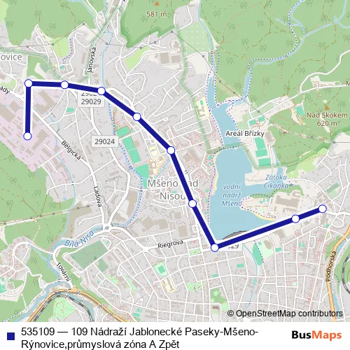 Click here to view the nearest 535109 - 109 Nádraží Jablonecké Paseky-Mšeno-Rýnovice,průmyslová zóna A Zpět bus stop.