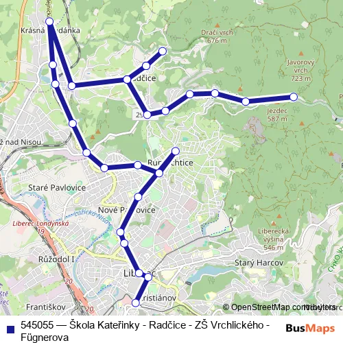 Bus 545055 - Škola Kateřinky - Radčice - ZŠ Vrchlického - Fügnerova in Liberec: Stops & Timetable