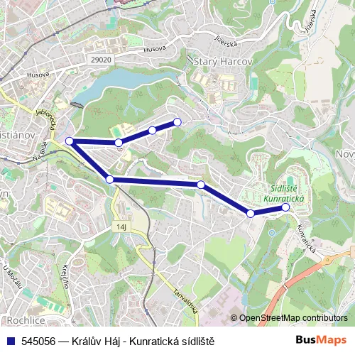 The first stop of the 545056 bus route is Liberec,Králův Háj and the last stop is Liberec,Kunratická sídl.. 545056 (Králův Háj - Kunratická sídliště) is operational during ve všední dny.